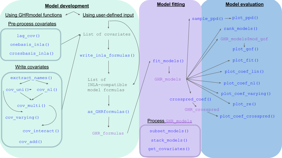 The image below shows the structure of the GHRmodel package, outlining its functions (in blue), GHRmodel-specific output objects (in purple), generic output objects (in grey), and general functionality. Generic output objects can be provided directly by the user or can be generated using GHRmodel helper functions.