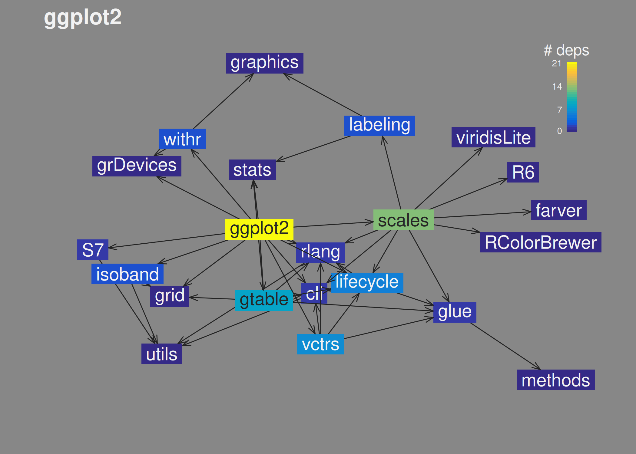 ggplot2 has 21 dependencies in total (direct and