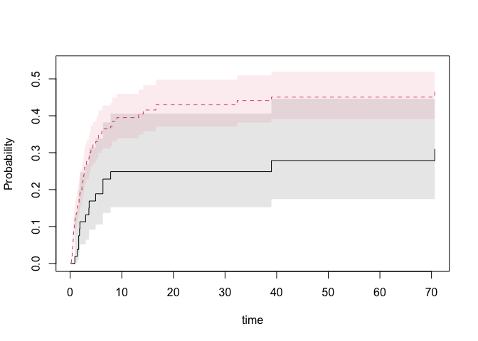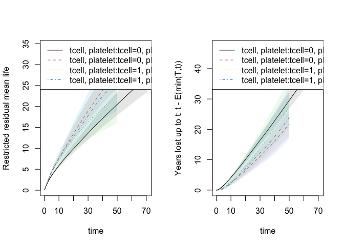 out1 <- resmeanATE(Event(time,cause)~tcell+platelet,data=bmt,cause=1,time=40,
