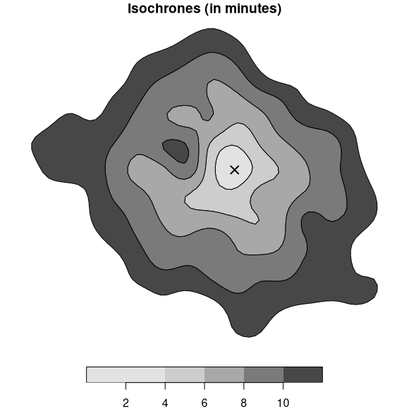 osrmIsochrone() computes areas that are reachable within a given time span from a point and returns the reachable regions as polygons. These areas of equal travel time are called isochrones. Here we compute the isochrones from a specific point defined by its longitude and latitude.